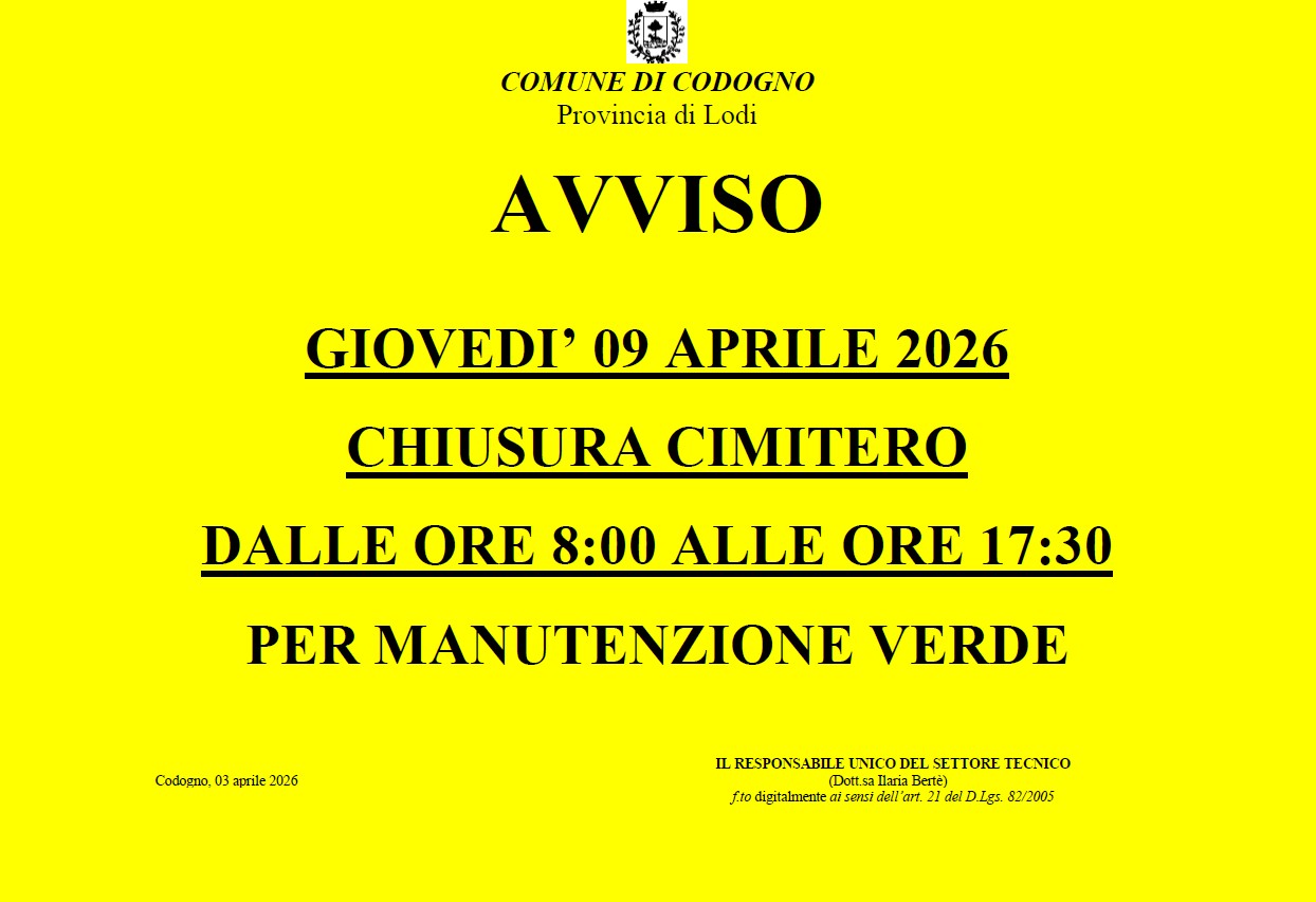 Si avvisa la cittadinanza che il giorno giovedì 09 aprile 2026 il cimitero rimarrà chiuso per manutenzione verde dalle ore 08:00 alle ore 17:30