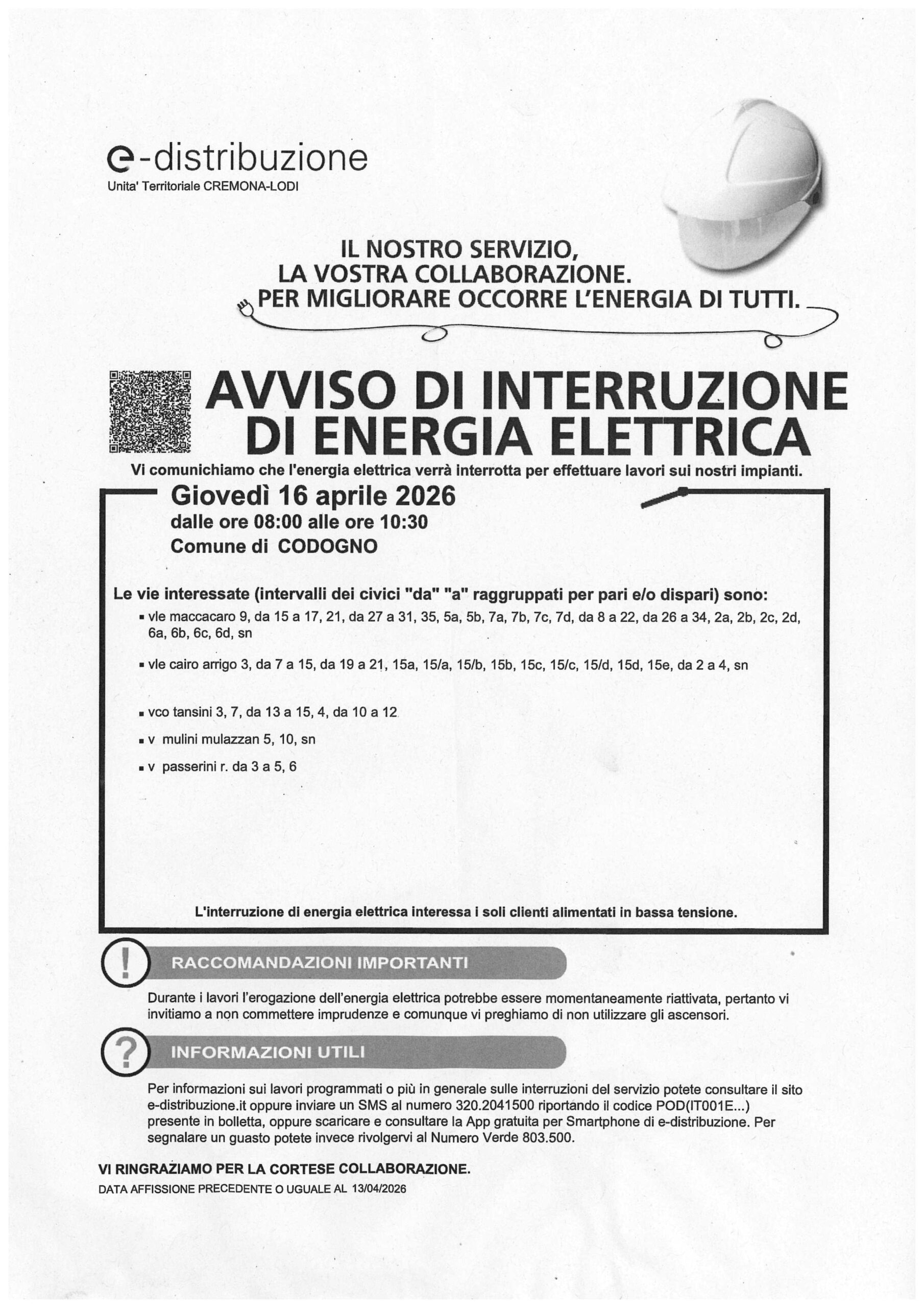 E-Distribuzione avvisa che vi sarà una interruzione temporanea della fornitura di energia elettrica per lavori sulla rete in alcune vie cittadine: