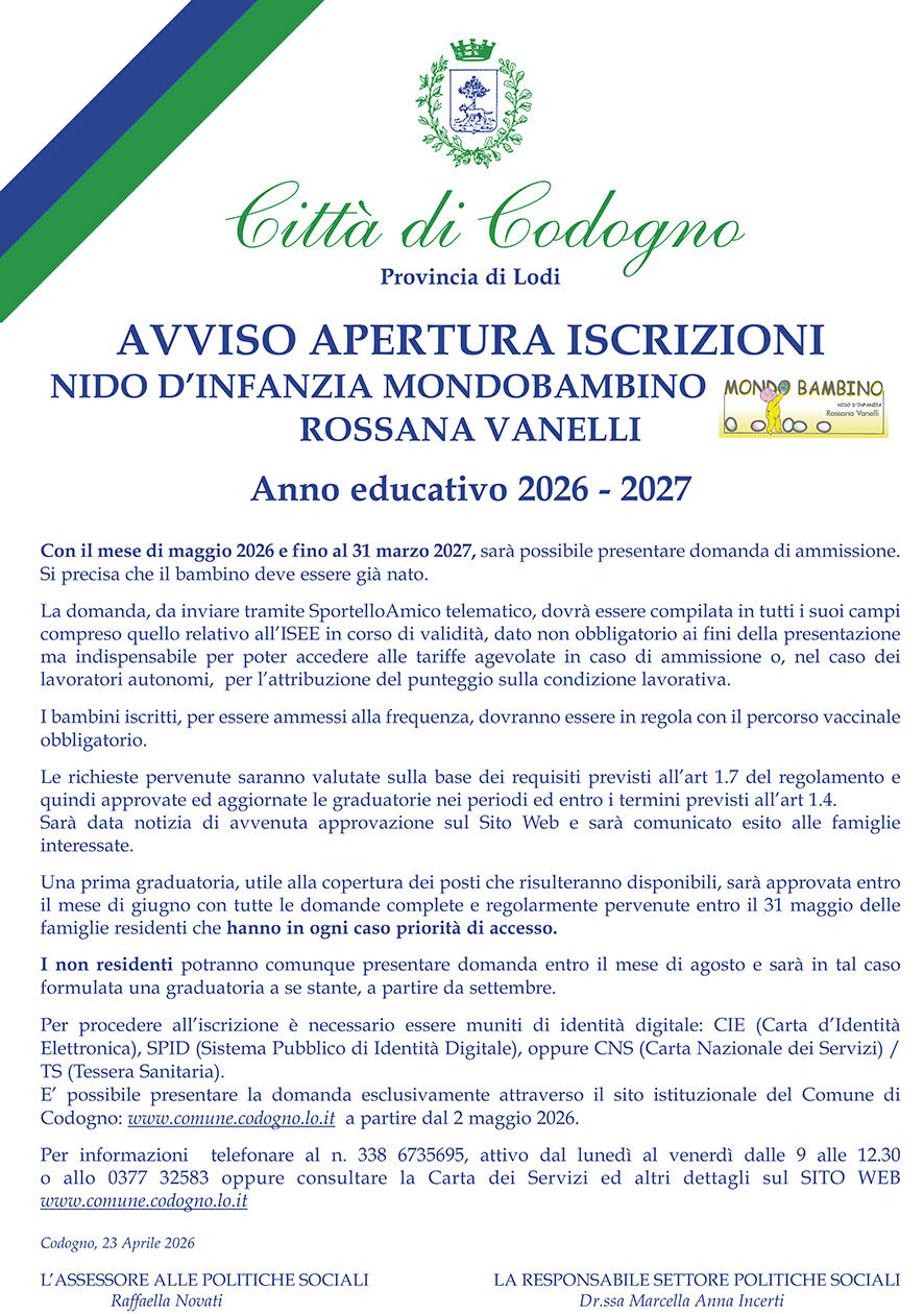 Da sabato 2 maggio 2026 riapriranno i termini per la richiesta di ammissione al Nido d’Infanzia Mondobambino Rossana Vanelli per l'Anno Educativo 2026-2027. L'assegnazione dei posti sarà fatta sulla base di quelli che si renderanno disponibili di norma dal mese di settembre e comunque durante l'intero anno.
