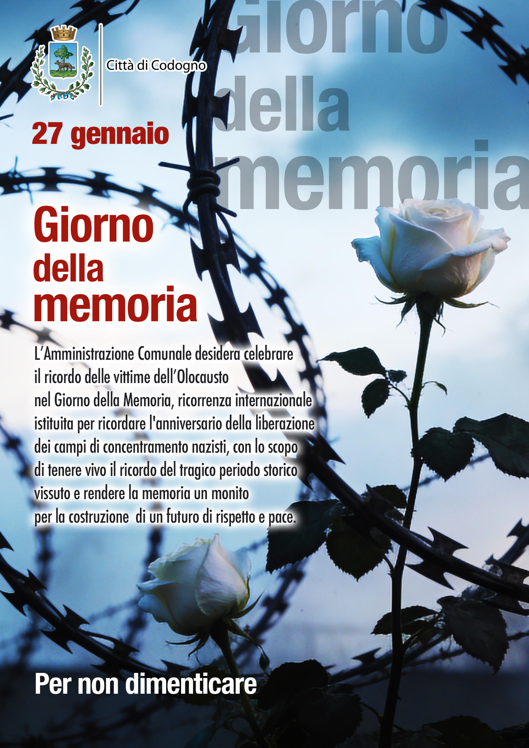 L’Amministrazione Comunale desidera celebrare il ricordo delle vittime dell’Olocausto nel Giorno della Memoria, ricorrenza internazionale istituita per ricordare l'anniversario della liberazione dei campi di concentramento nazisti, con lo scopo di tenere vivo il ricordo del tragico periodo storico vissuto e rendere la memoria un monito per la costruzione di un futuro di rispetto e pace