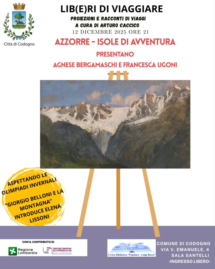 Il 12 dicembre 2025 alle ore 21:00 in Sala Santelli presso il Municipio, in via Vittorio Emanuele 4 vi aspettano Agnese Bergamaschi e Francesca Ugoni per presentarvi "Azzorre: Isole di avventura".