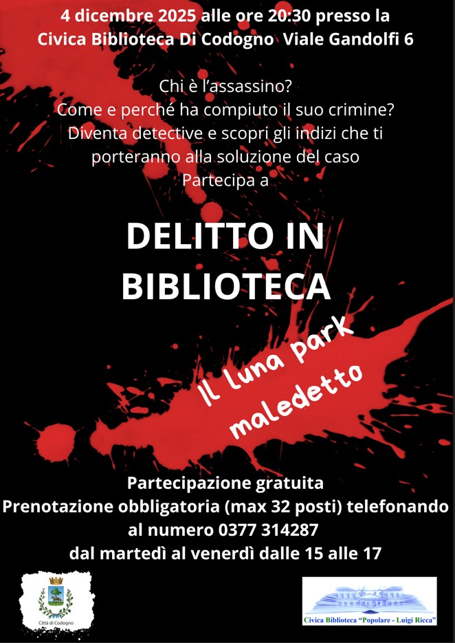 Il 4 dicembre 2025 alle ore 20:30 presso la Civica Biblioteca di Codogno viale Gandolfi 6 vi attende: Delitto in biblioteca. Chi è l’assassino? Come e perché ha compiuto il suo crimine?