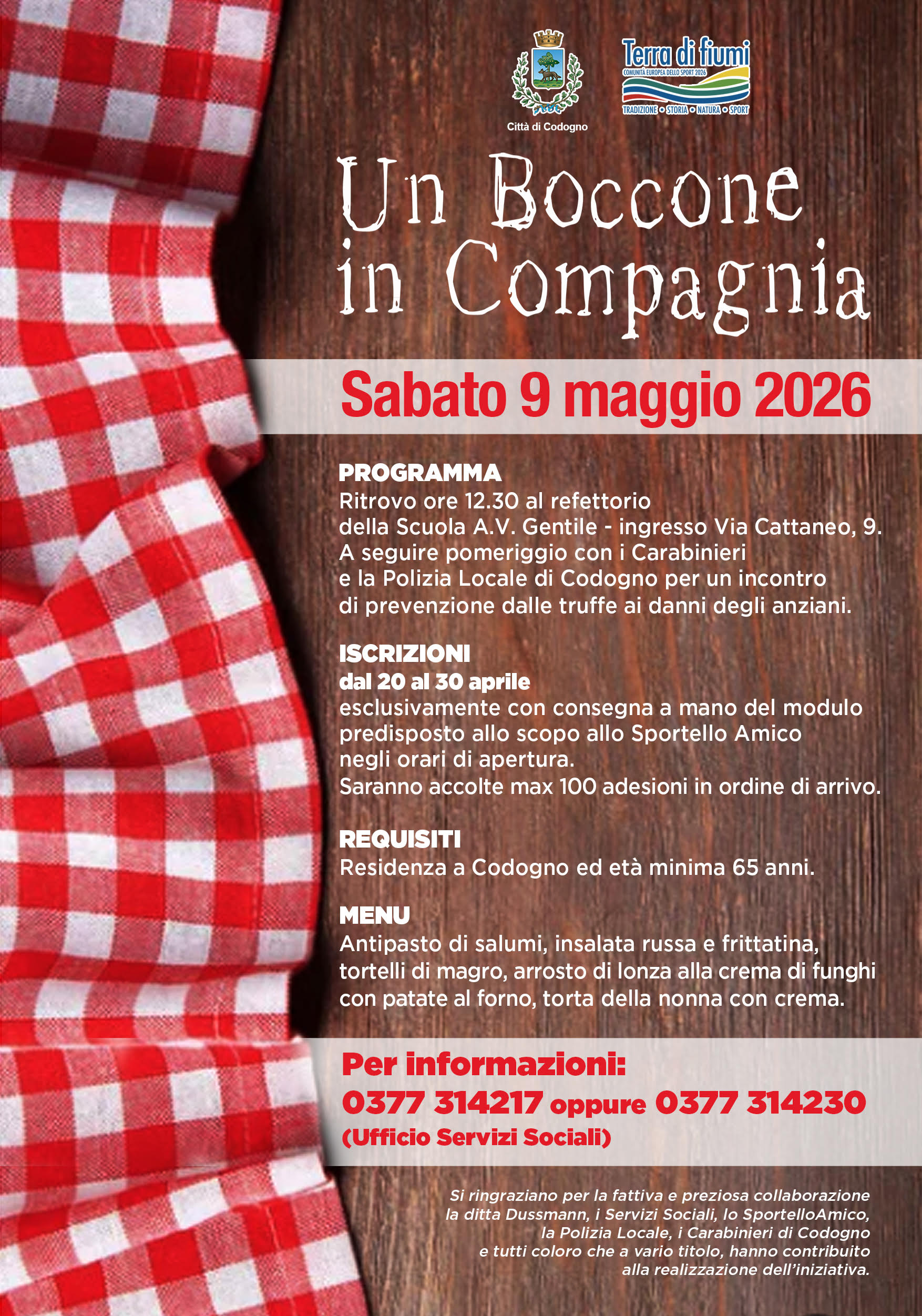 L'Amministrazione è lieta di invitare i residenti a Codogno con età minima 65 anni, all'iniziativa "un Boccone in Compagnia" il giorno Sabato 9 maggio 2026