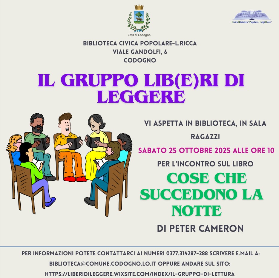 Il gruppo di lettura Lib-e-ri di leggere vi dà appuntamento per sabato 25 ottobre alle ore 10:00 presso la Biblioteca civica "Popolare-Luigi Ricca" viale Luigi Gandolfi 6 Codogno per commentare assieme il libro "Cose che succedono la notte" di Peter Cameron.