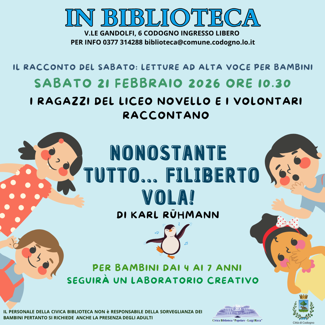 Per i piccoli lettori sabato 21 febbraio alle ore 10.30 presso la Biblioteca civica i ragazzi del Liceo Novello e i lettori volontari presentano 'Nonostante tutto… Filiberto vola!" di Karl Rühmann.