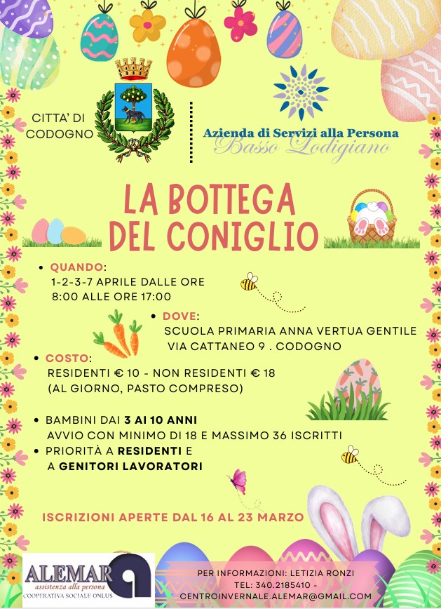Laboratori, rivolti a bambini dai 3 ai 10 anni, attivi durante la chiusura scolastica delle vacanze di Pasqua presso i locali della scuola primaria Anna Vertua Gentile in Via Cattaneo 9 a Codogno