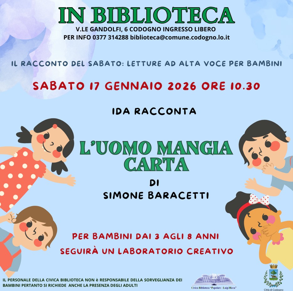 Aspettiamo i piccoli lettori sabato 17 gennaio alle ore 10:30 in biblioteca per un racconto dei Lettori volontari del Sabato. Ida racconta "L'uomo mangia carta" di Simone Baracetti