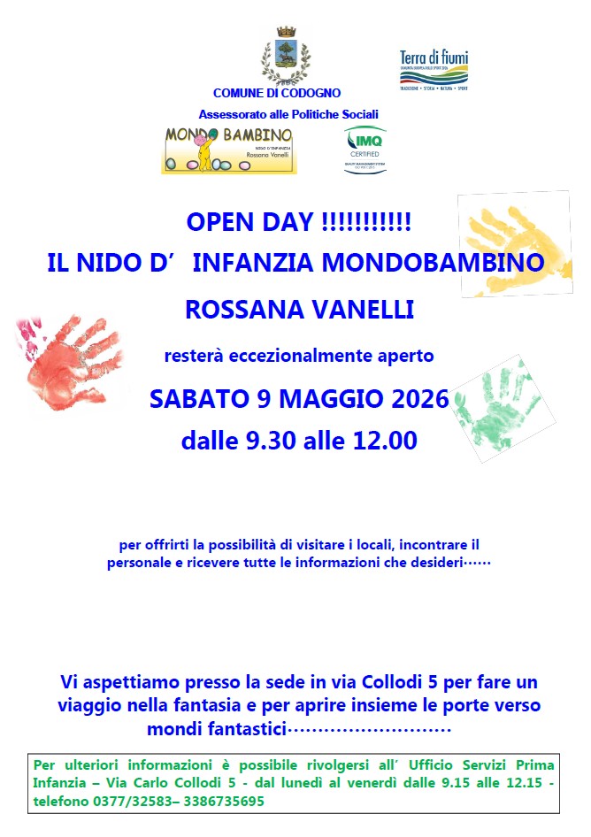 In vista delle iscrizioni per l’anno educativo 2026/2027, siamo lieti di invitare tutte le famiglie a scoprire il nostro Nido d’Infanzia nella mattinata di sabato 9 maggio dalle ore 09:30 alle 12:00 in via Collodi n. 5 Codogno.