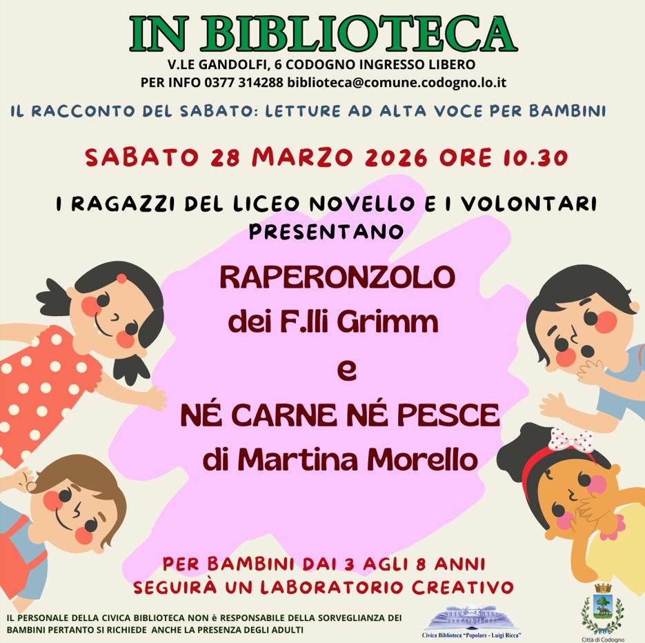 Per i piccoli lettori Sabato 28 marzo 2026 alle ore 10:30 presso la Civica Biblioteca "Popolare – Luigi Ricca" di Codogno Viale L. Gandolfi 6 Codogno i ragazzi del Liceo Novello e i lettori volontari presentano "Raperonzolo" dei fratelli Grimm e "Né carne né pesce" di Martina Morello