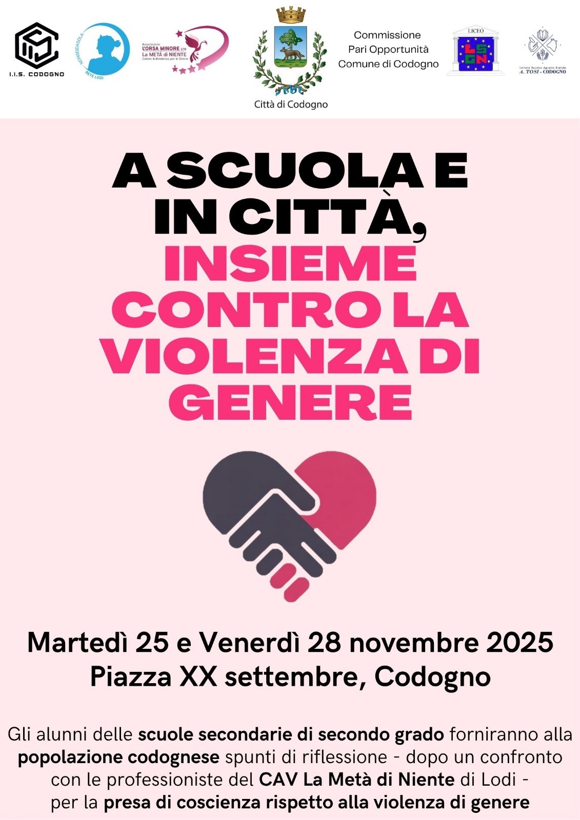 Gli alunni delle scuole secondarie di secondo grado forniranno alla popolazione codognese spunti di riflessione, dopo un confronto con le professioniste del CAV la Metà di Niente di Lodi, per la presa di coscienza rispetto alla violenza di genere